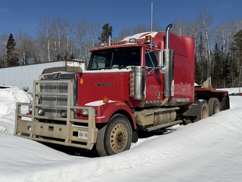 – 2001 Western Star, Cat engine, 18 spd trans, 46,000 rears, 11R 24.5 tires, sleeper, dual exhaust, moose bumper, starts and runs good
