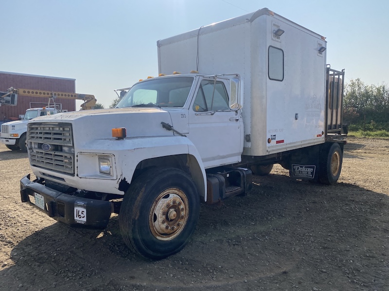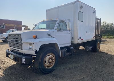 – 1987 Ford Single Axle Truck, w/ portable office, Ford diesel engine, 6 spd trans, single axle, 10R 20 tires, pintal hitch, w/ (2) water tanks in steel frames, showing approx, 73,750 kms / LOCATED AT: Prince Albert, SK